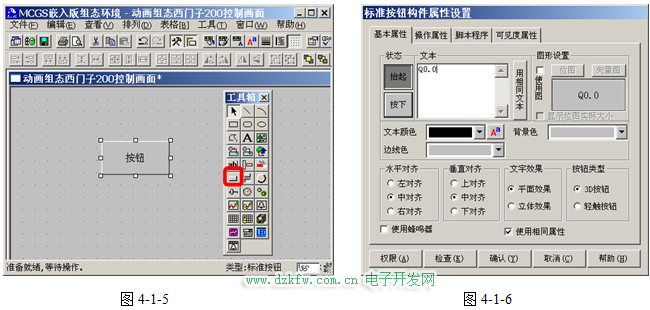 ①按鈕:從工具箱中單擊“標(biāo)準(zhǔn)按鈕”構(gòu)件,在窗口編輯位置按住鼠標(biāo)左鍵拖放出一定大小后,松開鼠標(biāo)左鍵,這樣一個(gè)按鈕構(gòu)件就繪制在窗口中。如圖4-1-5所示。