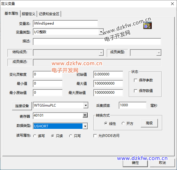 這里選擇的連接設備時WTGSimuPLC。寄存器是40101. 數據類型是無符號整數。通訊頻率為1000ms。有了這個變量可以在圖形中做可視化就可以讀取這個變量值了。