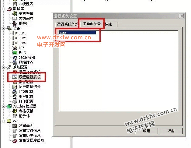 6、設置運行畫面。選回到工程瀏覽器界面,選擇“設置運行系統—主畫面配置—test”,目的是指定系統運行時打開的畫面(見下圖16)。