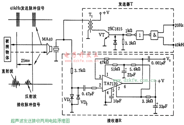 下圖是超聲波發送接收兩用電路,用一個超聲波傳感器發送信號的同時還可以接收信號。使用TA7120進行信號放大。