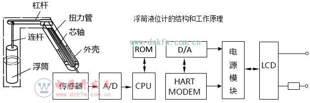 浮筒液位計由檢測、轉換、變送三部分組成;檢測部分由浮筒、連桿組成;轉換部分由杠桿、扭力管組件、傳感器組成;變送部分由CPU、A/D、D/A及LCD顯示器組成。如圖1所示。浮筒浸沒在外浮筒內的液體中,與扭力管系統剛性連接,外浮筒內液體的位置,或界面高低的變化,引起浸沒在液體中的浮筒的浮力變化,從而使扭力管轉角也隨之變化。液位越高時,浮筒所受浮力越大,扭力管所受的力矩就越小,扭角也越。环粗畡t越大。扭角的變化被傳遞到與扭力管剛性連接的傳感器,使傳感器輸出電壓變化,被放大轉換為4-20mA電流輸出。 浮筒液位計的結構和工作原理
