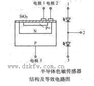 半導體色敏傳感器相當于兩個結深不同的光敏二極管的組合,故又稱為光敏雙結二極管。其結構原理及等效電路如圖所示。為了說明色敏傳感器的工作原理,有必要了解光敏二極管的工作機理。