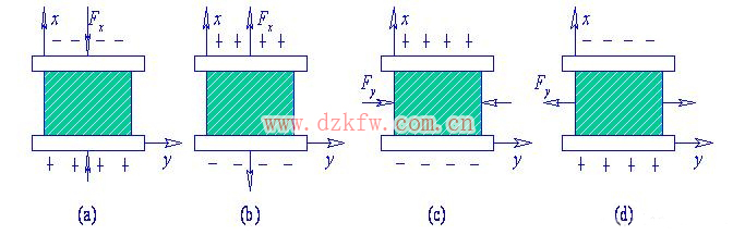 圖2表示晶體切片在z軸和y軸方向受壓力和拉力時電荷產生方向的情況。
