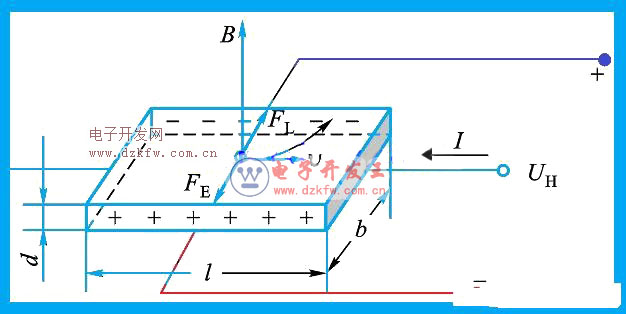 我們以半導(dǎo)體霍爾元件為例來說明它的工作過程。在下圖中我們給半導(dǎo)體霍爾元件通入電流I,然后把這個半導(dǎo)體薄片放在以磁場強(qiáng)度為B的磁場中,這時半導(dǎo)體內(nèi)的電子將受到一種磁力(洛侖茲力)F的作用就會向內(nèi)側(cè)移動,因此在內(nèi)側(cè)就堆積了很多電子,隨著電子堆積的越來越多,此時就會形成一種電場。當(dāng)電子既受到磁場力的作用,又受到電場力的作用,如果此時兩種力達(dá)到了一種平衡時,那么電子的堆積也就達(dá)到了一種動態(tài)平衡,這時候就建立起一種電壓,我們把這種電壓叫霍爾電動勢,一般用Eh表示,那么霍爾電動勢Eh可用Eh=KIB來表示。從這個式子可以看到,這個K是霍爾元件的靈敏度,這個I和B分別表示通入的電流和所在的磁場強(qiáng)度,因此我們知道,在通入電流一定的情況下,磁場強(qiáng)度越強(qiáng),那么所感應(yīng)的霍爾電動勢就越大。