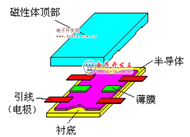 我們通過實驗可以知道單單用霍爾元件本身它所輸出的電壓是非常小的,同時我們又知道,半導(dǎo)體器件容易受溫度影響。因此現(xiàn)在的霍爾傳感器一般都把霍爾元件、放大器、溫度補償電路以及穩(wěn)壓電源等制作在一個芯片里,單就霍爾元件本身的結(jié)構(gòu)來說,一般它是由半導(dǎo)體、薄膜、襯底以及引線等部分構(gòu)成,如下圖所示。