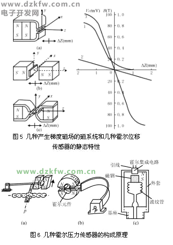 若令霍爾元件的工作電流保持不變,而使其在一個(gè)均勻梯度磁場(chǎng)中移動(dòng),它輸出的霍爾電壓VH值只由它在該磁場(chǎng)中的位移量Z來(lái)決定。圖6示出3種產(chǎn)生梯度磁場(chǎng)的磁系統(tǒng)及其與霍爾器件組成的位移感測(cè)器的輸出特性曲線,將它們固定在被測(cè)系統(tǒng)上,可構(gòu)成霍爾微位移感測(cè)器。從曲線可見,結(jié)構(gòu)(b)在Z<2mm時(shí),VH與Z有良好的線性關(guān)系,且分辨力可達(dá)1μm,結(jié)構(gòu)(C)的靈敏度高,但工作距離較小。用霍爾元件測(cè)量位移的優(yōu)點(diǎn)很多:慣性小、頻響快、工作可靠、壽命長(zhǎng)。以微位移檢測(cè)為基礎(chǔ),可以構(gòu)成壓力、應(yīng)力、應(yīng)變、機(jī)械振動(dòng)、加速度、重量、稱重等霍爾感測(cè)器。