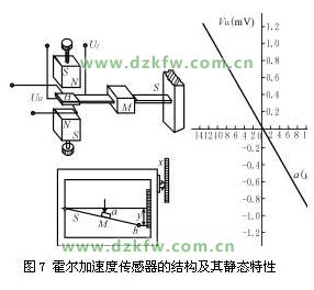 圖7示出霍爾加速度感測(cè)器的結(jié)構(gòu)原理和靜態(tài)特性曲線。在盒體的O點(diǎn)上固定均質(zhì)彈簧片S,片S的中部U處裝一慣性塊M,片S的末端b處固定測(cè)量位移的霍爾元件H,H的上下方裝上一對(duì)永磁體,它們同極性相對(duì)安裝。盒體固定在被測(cè)對(duì)象上,當(dāng)它們與被測(cè)對(duì)象一起作垂直向上的加速運(yùn)動(dòng)時(shí),慣性塊在慣性力的作用下使霍爾元件H產(chǎn)生一個(gè)相對(duì)盒體的位移,產(chǎn)生霍爾電壓VH的變化。可從VH與加速度的關(guān)系曲線上求得加速度。