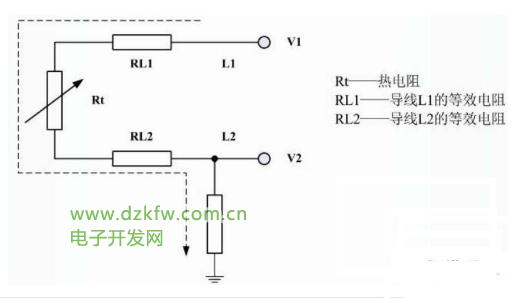 如下圖。變送器通過導線L1、L2給熱電阻施加激勵電流I,測得電勢V1、V2。