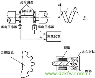 當扭矩作用在扭轉軸上時,兩個磁電傳感器輸出的感應電壓U1和U2存在相位差.這個相位差與扭轉軸的扭轉角成正比.這樣,傳感器就可以把扭矩引起的扭轉角轉換成相位差的電信號.