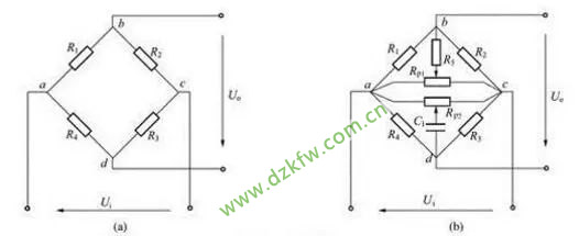 在未施加作用力時,應變為o,此時橋路輸出電壓Uo也為0,即橋路平衡,由橋路平衡的條件可知,應使4個橋臂的初始電阻R1,R2,R3和R4滿足R1R3=R2R4,或是R1/R2=R4/R3,通常取R1=R2=R3=R4即全等臂形式。