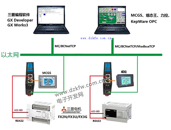無(wú)錫北辰BCNet-FX用于三菱FX1S/1N/2N/3S/3G/3U系列PLC、匯川PLC的以太網(wǎng)編程下載、上位監(jiān)控和設(shè)備聯(lián)網(wǎng)。不占用PLC編程口,上位機(jī)通過(guò)以太網(wǎng)對(duì)PLC數(shù)據(jù)監(jiān)控的同時(shí),觸摸屏可以通過(guò)復(fù)用接口與PLC進(jìn)行通訊。BCNet-FX支持工控領(lǐng)域內(nèi)絕大多數(shù)SCADA軟件,支持三菱以太網(wǎng)協(xié)議和透?jìng)鲀煞N通訊方式。