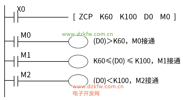 例如執行指令ZCP K60 D0 K100 M0表示:若數據寄存器D0的內容(D0)<K60,則M0接通,若K60≤(D0)≤K100,則M1接通;若(D0)>K100,則M2接通。