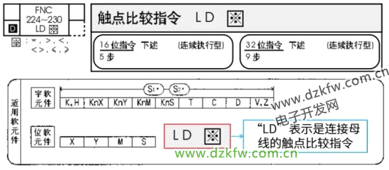 所謂“起始”,是指這指令與母線相連接,以“LD”開頭,其用法類似于“LD(取)”指令。起始觸點比較指令一共有6個,如下圖所示。