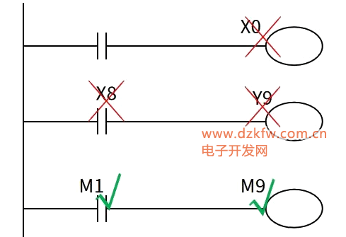 X繼電器只有常開、常閉兩種觸點(diǎn)狀態(tài),沒有線圈,但Y、M、S均有觸點(diǎn)和線圈。除了X、Y,其他的軟元件都是按十進(jìn)制編排,例如位元件M、S,顯然出現(xiàn)M8、S9等是完全沒問題的。