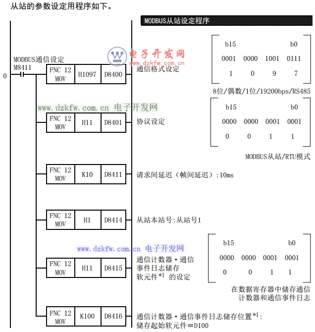 使用將LD M8411作為接點的MOV指令,在特殊數據寄存器中設定通信參數。