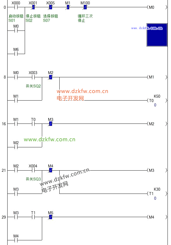 • 工作方式:1.小車連續循環與單次循環可按S07自鎖按鈕進行選擇,當S07為“0”時小車連續循環,當S07為“1”時小車單次循環;2.小車連續循環,按停止按紐S02小車完成當前運行環節后,立即返回原點,直到碰SQ1開關立即停止:當再按啟動按紐S01小車重新運行;3.連續作3次循環后自動停止,中途按停止按鈕S02則小車完成一次循環后才能停止。