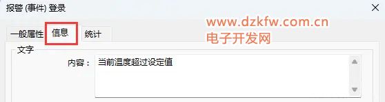 然后需要在事件登錄中添加M0作為報(bào)警信息,顯示信息設(shè)置為“當(dāng)前溫度超過(guò)設(shè)定值”