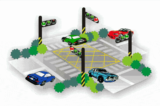 南北紅燈、東西綠燈同時亮起,接著東西方向綠燈熄滅、黃燈閃爍三秒,紅燈亮起、南北方向綠燈亮起;然后南北方向綠燈熄滅、黃燈閃爍三秒,紅燈亮起,進行循環(huán)。