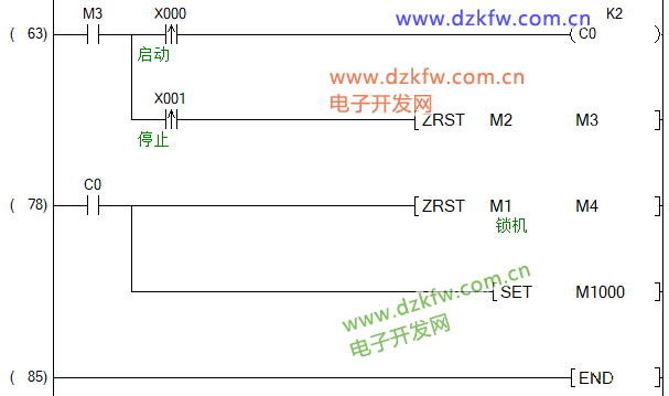 在M3的條件下,如果按下X1,就會復位M2、M3,回復到初始狀態,如果按2次X0按鈕,就會觸發C0計數器,計數一到,復位M2、M3的同時,置位M1000,解除鎖機,該點可以掉電保持,重新啟動機器就不需要重復解鎖了