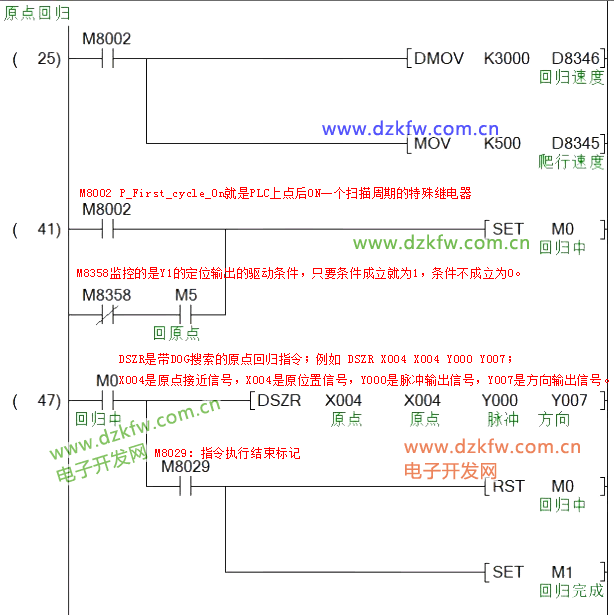 當plc開機時,或者觸摸屏按下回原點按鈕M5時,觸發(fā)M0去驅(qū)動原點回歸指令,執(zhí)行原點回歸,執(zhí)行完畢就復位M0,同時置位M1,M1置位原點回歸完成標志位,它導通了說明原點回歸完成,后面才可以控制自動控制的動作。