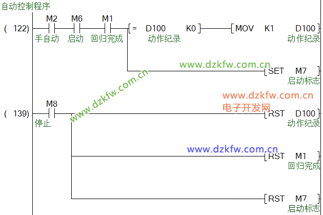 4、自動控制啟停:在手動狀態(tài),并且回原點完成,D100 =0時,就進入第1步動作,導通M7啟動標志位,順序運行的程序在后面寫。