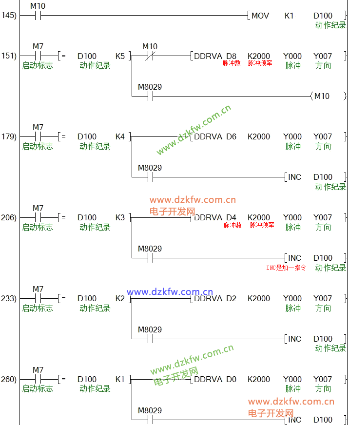 5、順序控制:動作需要逆序?qū)懀谝徊綄懺谧詈螅瑒幼魍瓿蒑8029會導通,使用INC讓D100加1,后面每一步都一樣;運行到第5步,用M8029導通M10線圈,M10的常開寫在這一行程序上面,用MOV指令讓D100回到第1步,這樣寫是為了隔開一個掃描周期,讓第5步的動作和第一步的定位指令不在同一個掃描周期里面運行。