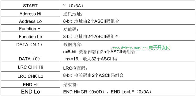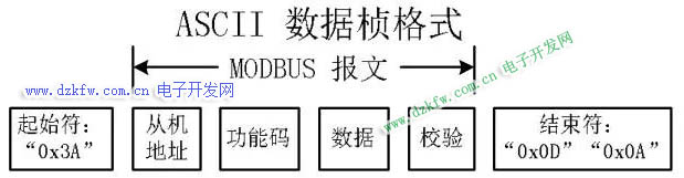 采用ASCII模式傳輸數據,在 ASCII 模式中,幀頭為“:”(“0x3A”),幀尾缺省為“CRLF”(“0x0D”“0x0A”)。