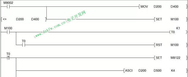 M8122是送信指令, 表示在發送信息,ASCI D200 D500 K4.D200為頻率數據, 將D200數據轉換成ASCII,例如D200=0ABCH,K4就表示D500=0,D501=A,D502=B,D503=C,只轉換4位。