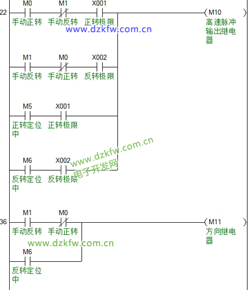 我們先來定義一下脈沖輸出和方向輸出的兩個輔助繼電器M10和M11,以后我們不再直接控制脈沖和方向,而是控制這兩個繼電器來實現