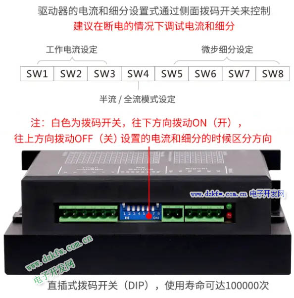 1、撥碼開關(如下圖):用于驅動器的工作電流,細分,半流/全流等參數的設置。