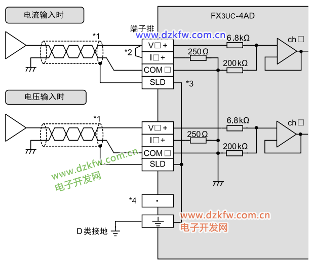 五、 三菱PLC模擬量信號接線 接線:4AD模塊需要驅動電源。請確認是否正確接線。此外,請確認AD模塊的24V燈是否亮燈。使用電流輸入時,使用的通道的V+端子和I+端子必須短接。不短接的話,不能轉換成正確的數字值。模擬量的輸入線,使用2芯的屏蔽雙絞電纜,屏蔽層接地,此外,請與其它動力線或者易于受感應的線分開布線。 六、 三菱PLC模擬量信號接線編程實例 1、程序分析先定義采集模擬量信號類型,定義將數據傳送到目標寄存器,還要設置采樣平均次數,數字濾波,減少外部干擾。