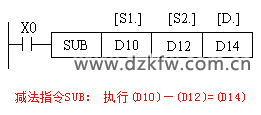 (D)SUB(P)指令的功能是將[S1.]指定元件中的內(nèi)容以二進(jìn)制形式減去[S2.]指定元件的內(nèi)容,其結(jié)果存入由[D.]指定的元件中。如下圖所示,當(dāng)X0為ON時,執(zhí)行(D10)—(D12)→(D14)。