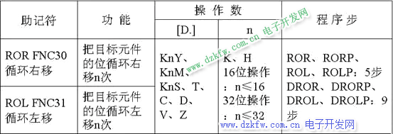 執行RCR、RCL指令時,各位的數據與進位位M8022一起(16位指令時一共17位)向右(或向左)循環移動n位。在循環中移出的位送入進位標志,后者又被送回到目標操作元件的另一端。