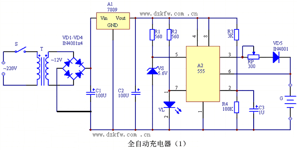 電壓比較器由時基電路A2組成,在它的控制端5腳接有一個穩壓二極管VS(穩定電壓5.6V),所以將電路的復位電平定位在5.6V。發光二極管VL為充電指示器。