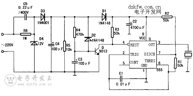 電路如圖所示:電路由電容C1(0.01 μ F)、C2(4700μ F)、C3和C4(100D F)、C5(0.22 μF/400V),電阻R1、R2及R3(50k)、R4(470k)、R5(10k)、R6(1M).二極管D1和D2(1N4148)、D3(1N4001)、D4(12V穩壓管),壓電蜂鳴器HTD,U(555)雙極型時基集成電路組成。