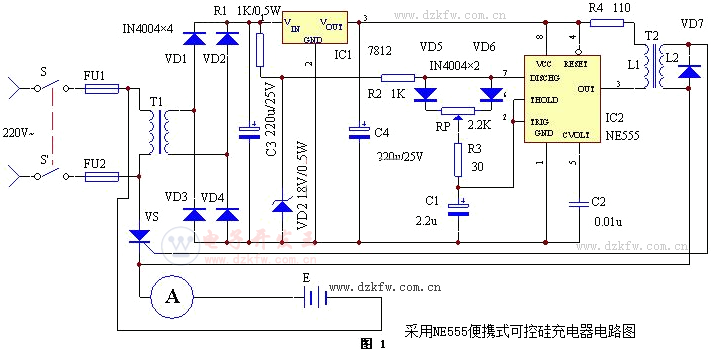 該觸發電路輸出的脈沖,其寬度比任何由單結晶體管構成的觸發電路輸出的脈沖大幾倍,能夠可靠地觸發反電勢負載和大電感負載電路中的可控硅可靠導通。主控電路由熔斷器FU、電流表和可控硅VS組成,接上待充電的電池或蓄電池(組)后,可控硅VS獲得觸發脈沖,就以不同脈寬的脈沖控制VS的導通角,調節RP就可以滿足不同充電電流或電壓不同的蓄電池(組)充電。