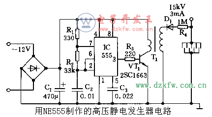 用NE555制作的高壓靜電發生器電路圖