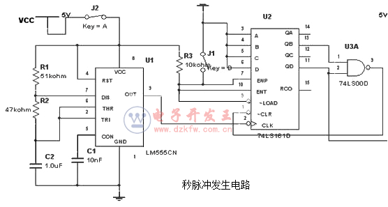 采用555構成的多諧振蕩電路(即脈沖產生電路),其電路原理圖