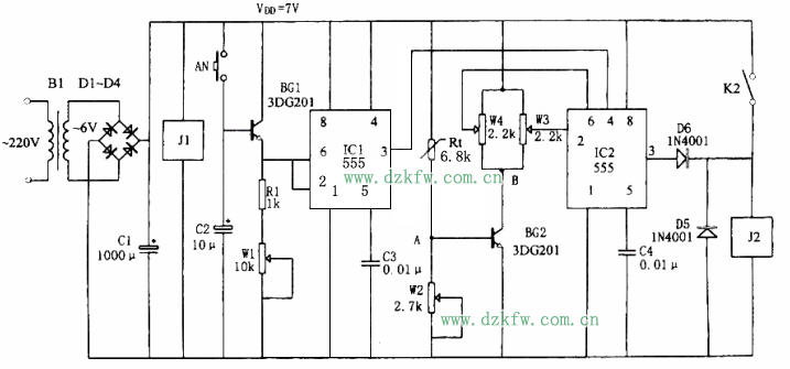 定時控制電路由IC1(555)和BG1、C2、R1、W1等組成。按一下開關AN,則BG1管導通,555因⑥腳為高電平而復位,③腳輸出的低電平又加到IC2(555)的復位端,強制IC2復位。相應C2通過BG1的發射結、R1、W1進行放電,當C2放電到使IC1②腳電位低于1/3VDD時,IC1發生置位,③腳輸出高電平,定時時間到。同時IC2因④腳呈商電平而處于等待觸發狀態。