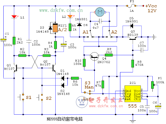 該電路使用晶體管,集成電路和一個(gè)繼電器的混合物,并且用于自動(dòng)地打開和關(guān)閉的一對(duì)簾。使用開關(guān)S3還允許手動(dòng)控制,使窗簾,只留部分打開或關(guān)閉。該電路控制一個(gè)連接到一個(gè)簡(jiǎn)單的滑輪機(jī)構(gòu)的馬達(dá),以移動(dòng)窗簾。