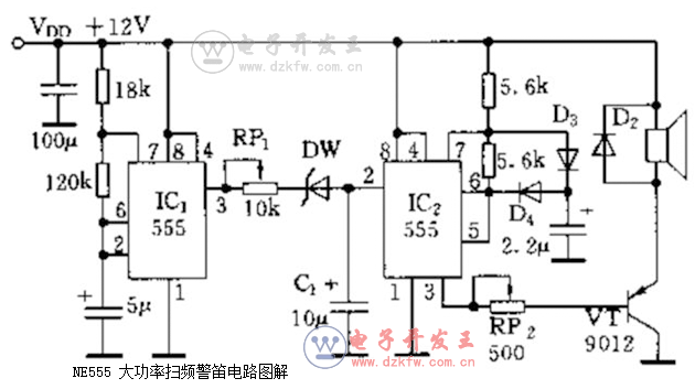 如圖所示,電路由兩個NE555組成,第一個多諧振蕩器的振蕩頻率在5Hz左右,3腳輸出的方波經電位器RP、DW加至IC的2腳,電容器C1上形成的三角波使IC2產生頻率由高到低、又由低到高的掃頻振蕩,類似于警笛的效果。IC2的控制電壓端5腳與閥值端6腳短接,更加強了警笛的音響效果,推動級視實際應用場合,決定是否采用大功率三極管和高音喇叭。