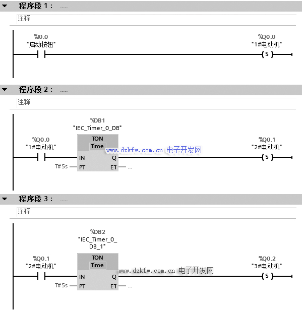 圖 3-10 為四臺(tái)電動(dòng)機(jī)順序定時(shí)啟動(dòng)、同時(shí)停止的 PLC 梯形圖。圖中用到三個(gè)定時(shí)器,調(diào)用三 個(gè) DB 塊,如圖 3-11 所示。