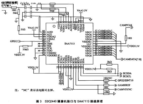 S3C2440的攝像機接口接收ITU標準的圖像數據,不能直接接收CCD攝像機輸出的模擬視頻信號,因此還需要1片SAA7113視頻解碼芯片。SAA7113可以輸入4路模擬視頻信號,通過內部寄存器的不同配置可以對4路輸入進行轉換,輸入可以為4路CVBS或2路S視頻(Y/C)信號,輸出8位“VPO”總線,為標準的ITU 656、YUV 4:2:2格式。對SAA7113初始化需要通過I2C 總線進行,而S3C2440內部集成的I2C控制器正好可以實現這個過程。S3C2440 的攝像機接口與SAA7113的連接原理如圖3所示。