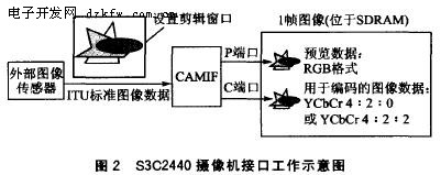 對照圖2和圖3可以看出,SAA7113芯片就是圖2的“外部圖像傳感器”。它向嵌入式系統的攝像機接口提供了采樣到的標準ITU 視頻數據。這些數據經過DMA的P端口或C端口控制傳輸到了內存,這樣就可以在內存中對圖像數據作進一步的加工處理。