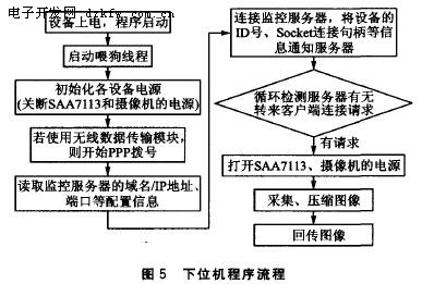下位機軟件通過驅動程序提供的接口,在遠程圖像監控設備中完成硬件的初始化、控制等功能,同時又負責圖像的壓縮和傳輸。它是所有設備的控制中樞,因此這里著重描述下位機軟件的工作流程,如圖5所示。
