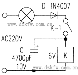 工作原理:剛通電時,電源電壓經燈泡、D、K—1(繼電器常閉觸點)及兩端并有電容的K(繼電器線圈)形成回路,燈泡點亮。同時C被充電,繼電器瞬間吸合,K-1斷開,燈泡熄滅。K-1斷開后,電路被切斷,C對K放電,繼電器維持吸合,由于C容量較大,其吸合會維持一定的時間。