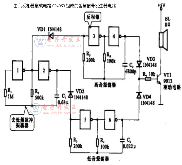 圖所示是一個由六反相器集成電路CD4069組成的警笛信號發(fā)生器電路。反相器1、2組成超低頻脈沖振蕩器,非門3、4組成高音振蕩器.非門5、6組成低音振蕩器。超低頻脈沖振蕩器的輸出通過二極管VDI、VD2控制高、低音振蕩器輪流振蕩,振蕩信號分別經(jīng)VD3、VD4由半導(dǎo)體三極管VT1放大后推動揚聲器發(fā)出的警笛聲響。