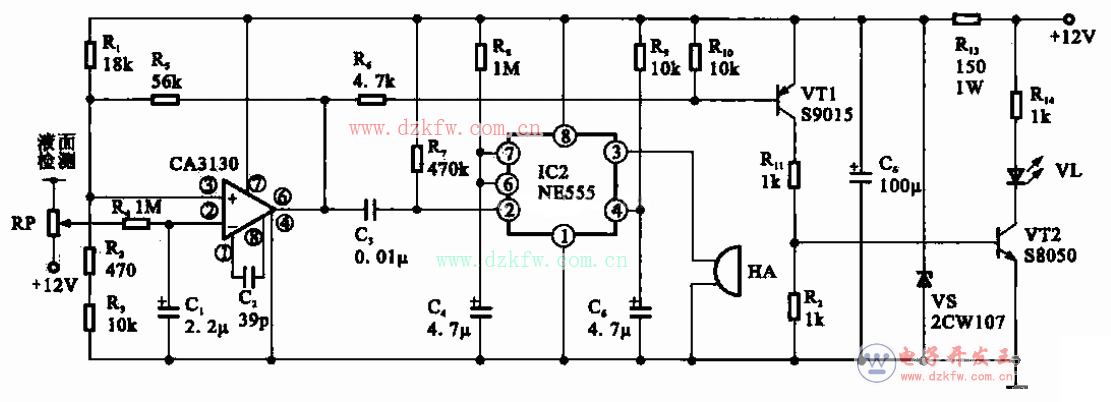 汽車油量檢測報(bào)警電路:電路工作原理,通過可調(diào)電阻RP阻值(這個是油箱里面的浮動裝置)的大小變化,再經(jīng)過差動放大器CA3130進(jìn)行放大,最后NE555時基電路進(jìn)行處理輸出到報(bào)警器。