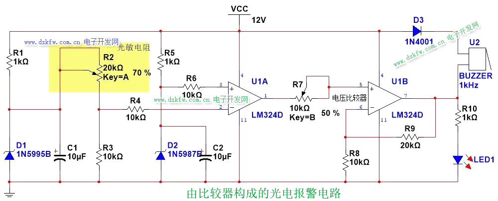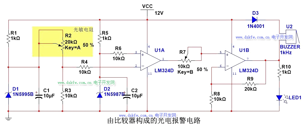 今天我們借助一個有趣的電路——由比較器構成的光電報警電路,來學習好了解一下比較器。