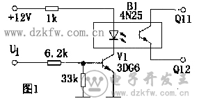 圖1電路中,當輸入信號ui為低電平時,晶體管V1處于截止狀態,光電耦合器B1中發光二極管的電流近似為零,輸出端Q11、Q12間的電阻很大,相當于開關“斷開”;當ui為高電平時,v1導通,B1中發光二極管發光,Q11、Q12間的電阻變小,相當于開關“接通”.該電路因Ui為低電平時,開關不通,故為高電平導通狀態.同理,圖2電路中,因無信號(Ui為低電平)時,開關導通,故為低電平導通狀態.